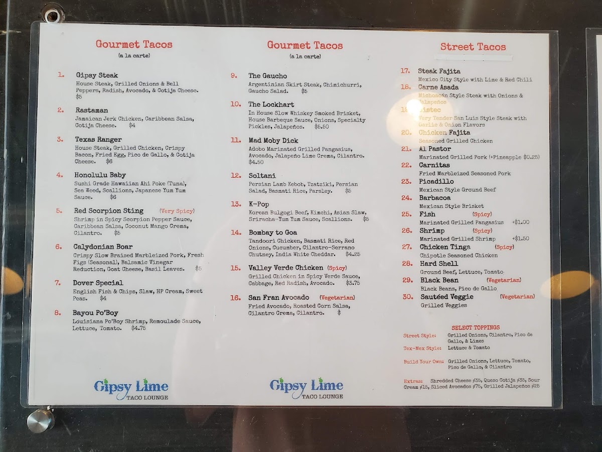 Located in Irving, TX, Gipsy Lime is a culinary hotspot celebrated for its gourmet tacos and vibrant atmosphere. The menu showcases a delightful array of tacos, including the Gipsy Steak House, Rastaman Jerk Chicken, and the Texas Ranger, each bursting with unique flavors and high-quality ingredients. Tacos are served alongside hearty choices like burritos and bowls, allowing for a customizable dining experience.